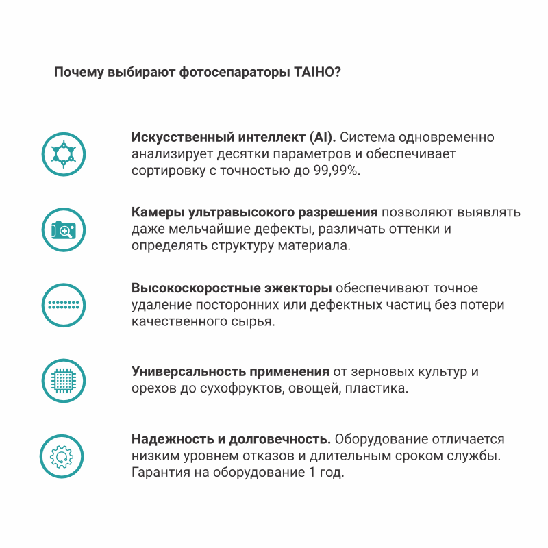 Фотосепараторы TAIHO Observation М поддерживают интеллектуальные настройки по фото 1-го поколения. Процесс представляет собой полуавтоматическую настройку сортировки по цвету на основании данных на фото.