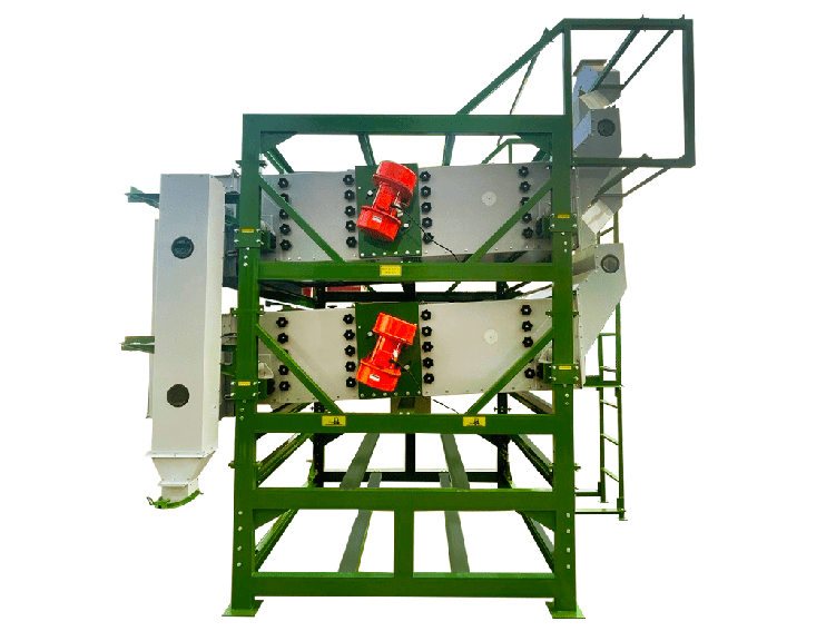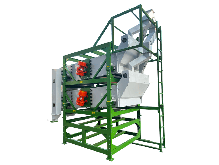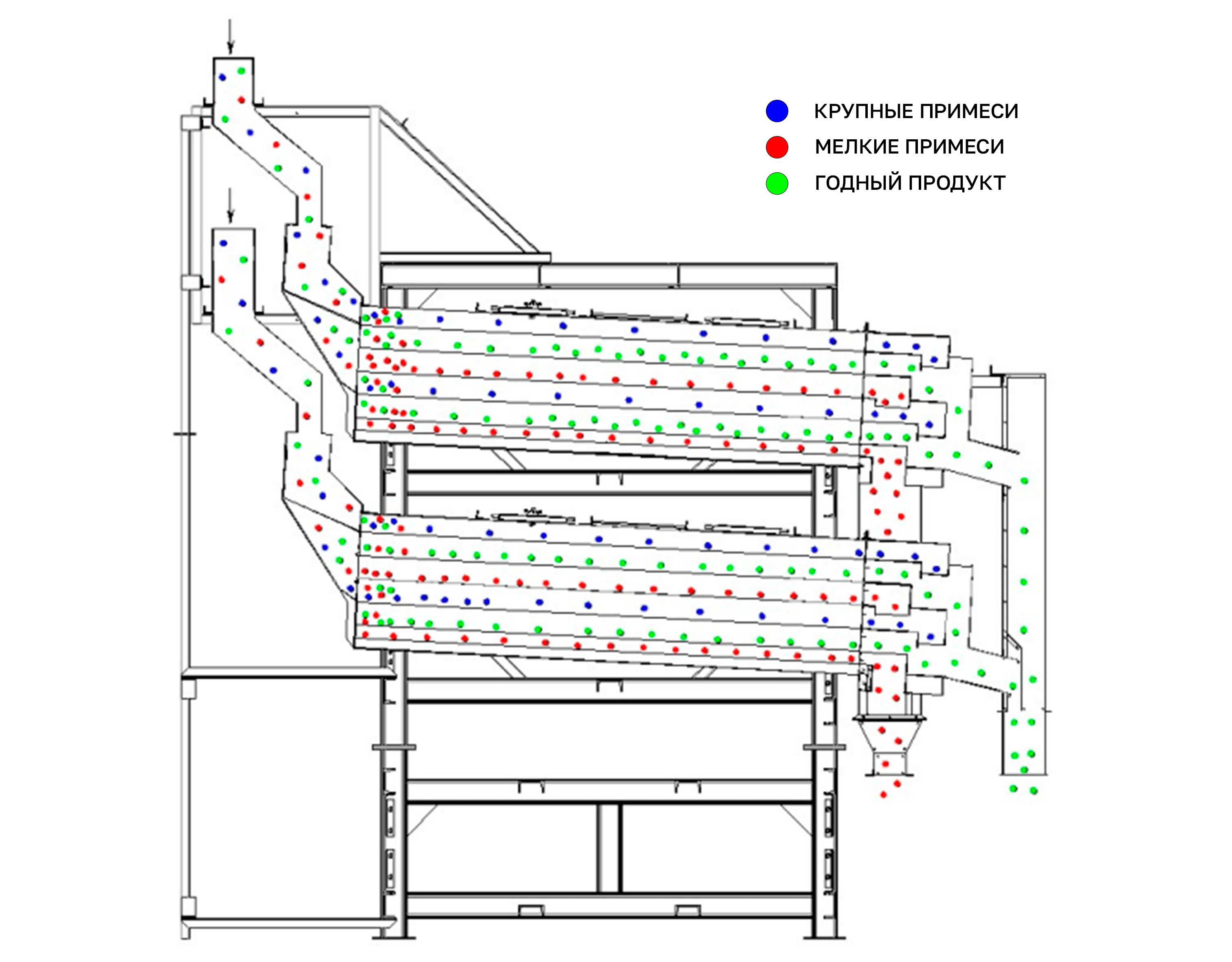 Калибратор состоит из бункера для приема материала, просеивающего короба, ситовой рамы, ситового полотна, бункера для сброса очищенного материала и вибродвигателя. Сепаратор имеет несколько уровней решет с разным количеством отверстий, которые при просеивании и сортировке делят материал, согласно разным классам качества.
