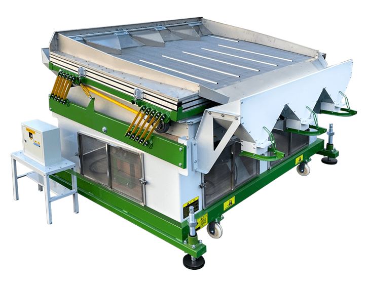 Камнеотборник серии QSC с двойным проходом выбивает камни под давлением и регулируемой силой воздушного потока. Частицы с большим удельным весом (камни) опускаются на поверхность деки, более легкие фракции – всплывают над тяжелыми и движутся вверх в направлении колебаний.