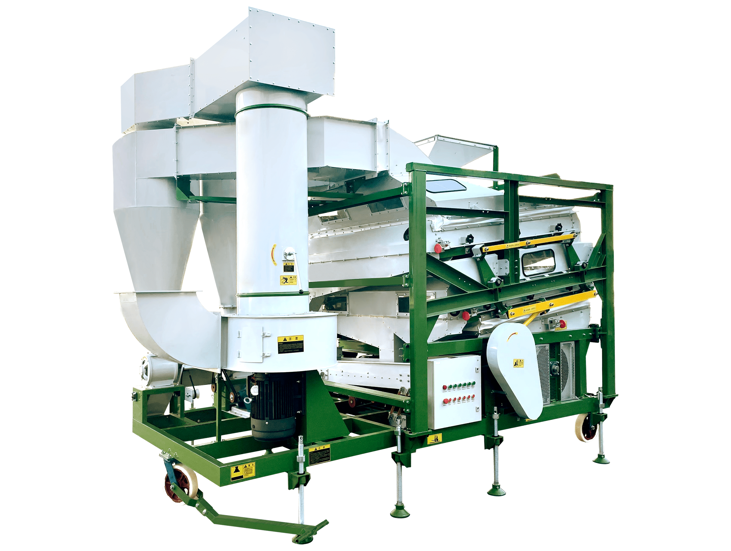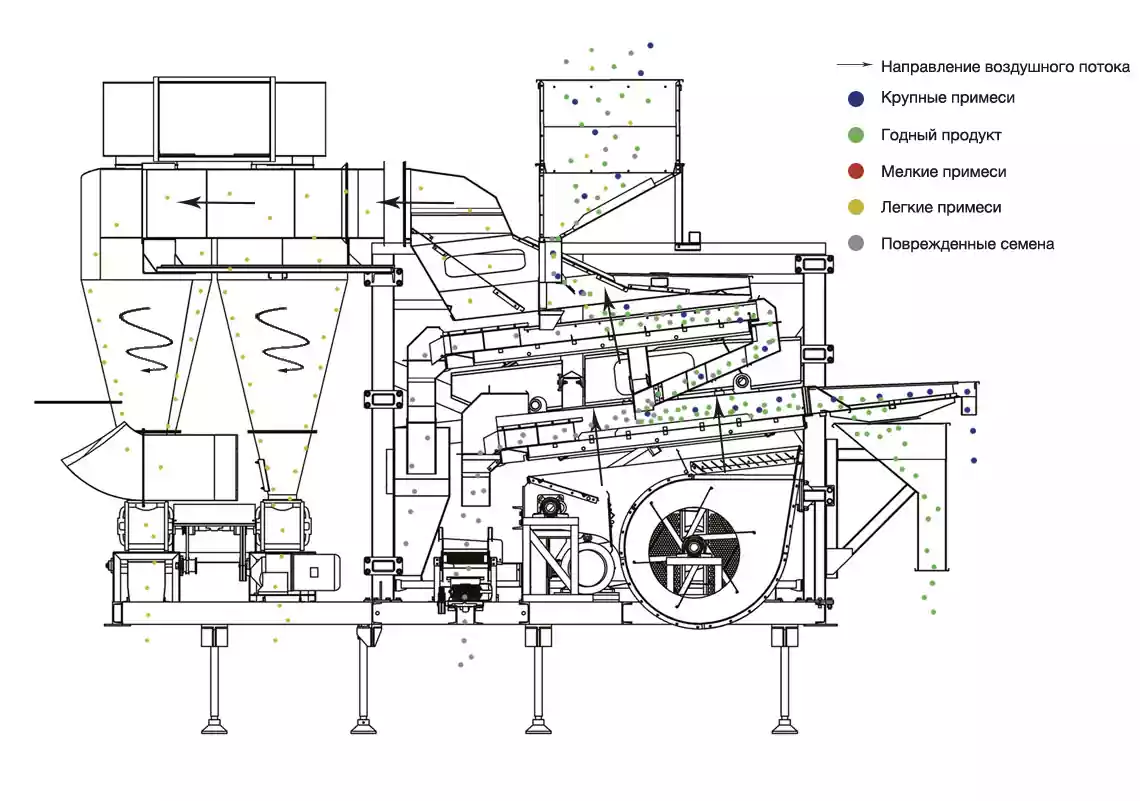 Комбинированный воздушно-гравитационный сепаратор подходит для очистки разных видов сельхозпродукции; производительность до 40 т/час для пшеницы. Он очищает продукт от пыли, соломы, сечки, шелухи и других легких примесей. Удаляет гнилые, прелые, плесневелые и проросшие семена, а также семена, пораженные насекомыми и бактериозом. Подходит для зерна или семян с большим количеством примесей.