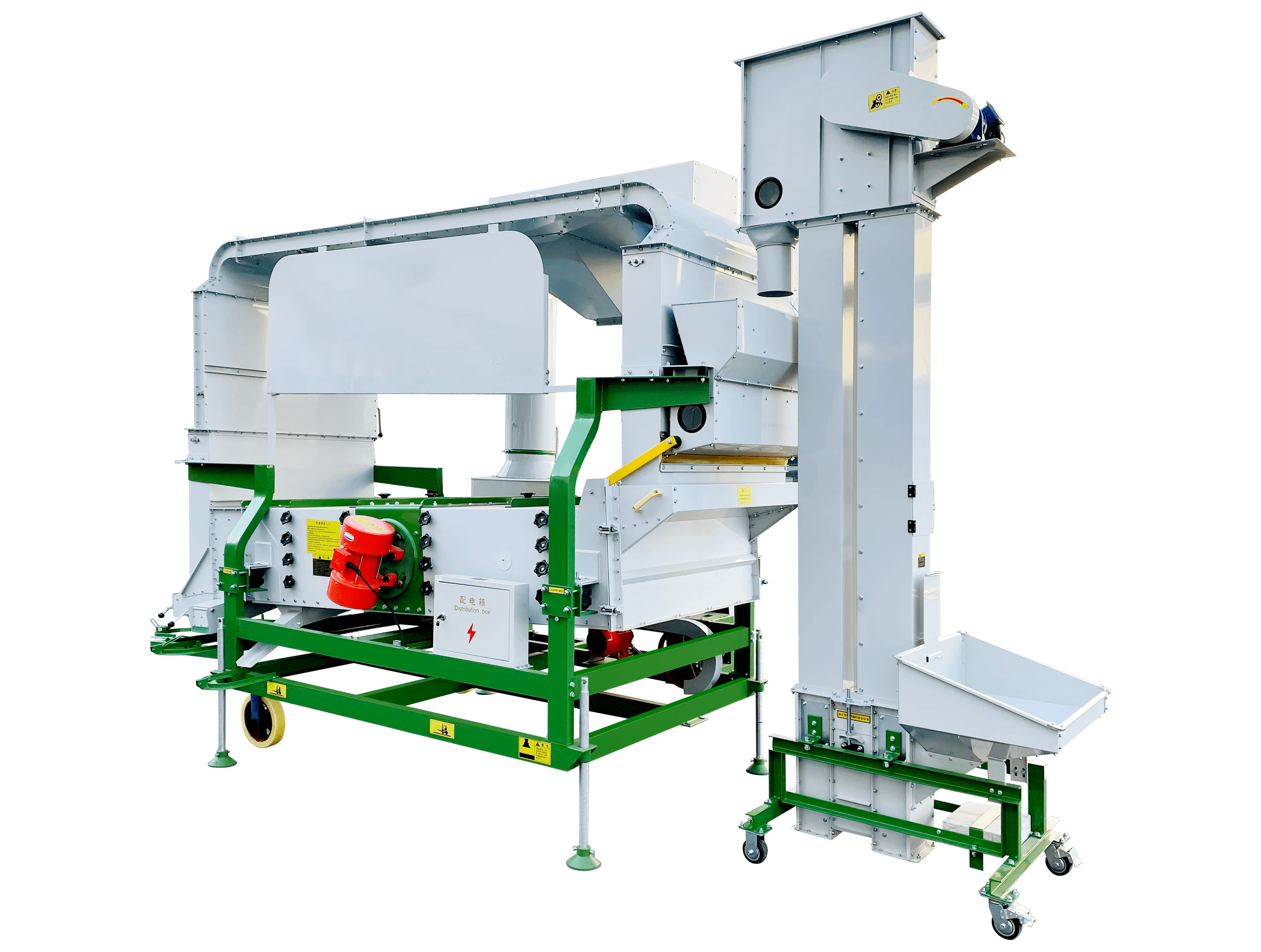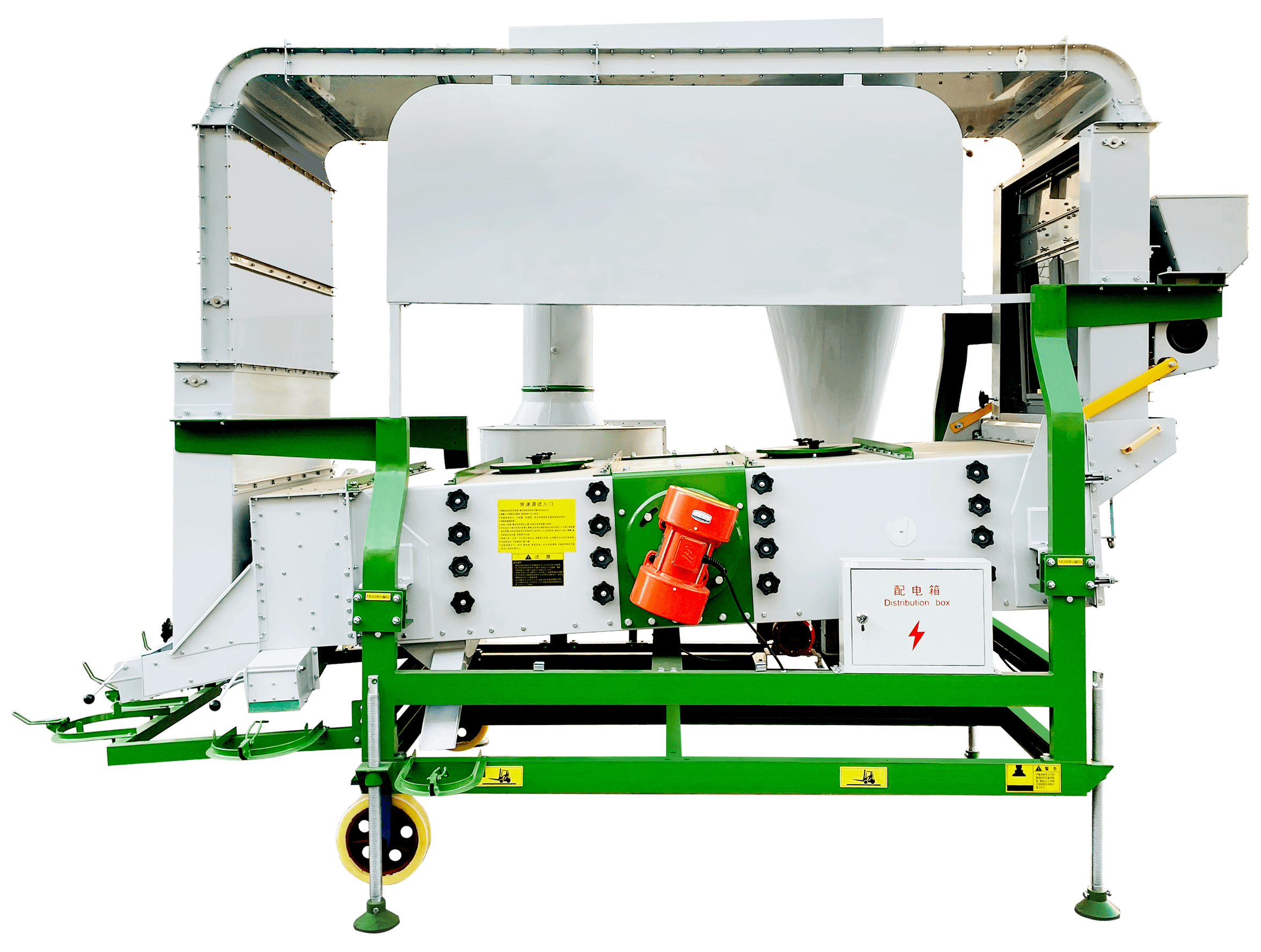Очищаемый материал, попадая в приемный патрубок, подвергается первичной воздушной очистке от пыли и легких примесей, далее калибруется по толщине с помощью набора решет. Количество решет – от 1 до 5, что позволяет использовать модель 5XFS-7.5FC в качестве калибратора. Благодаря модульности конструкции возможна установка дополнительного аспирационного канала на сходе очищенного материала.