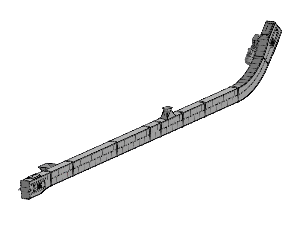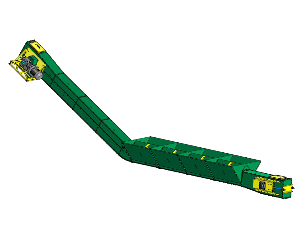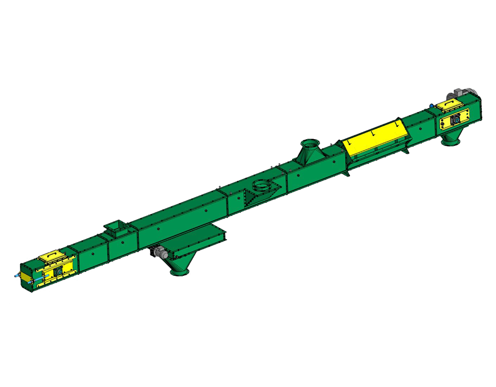 Комплектация: Секция привода; Натяжная секция; Мотор-редуктор; Цепь со скребками; Секция линейная горизонтальная; Секция наклонная (угол 15°, 30°, 45°); Секция прямой загрузки; Секция боковой загрузки; Секция двухсторонней загрузки; Аспирационная секция.