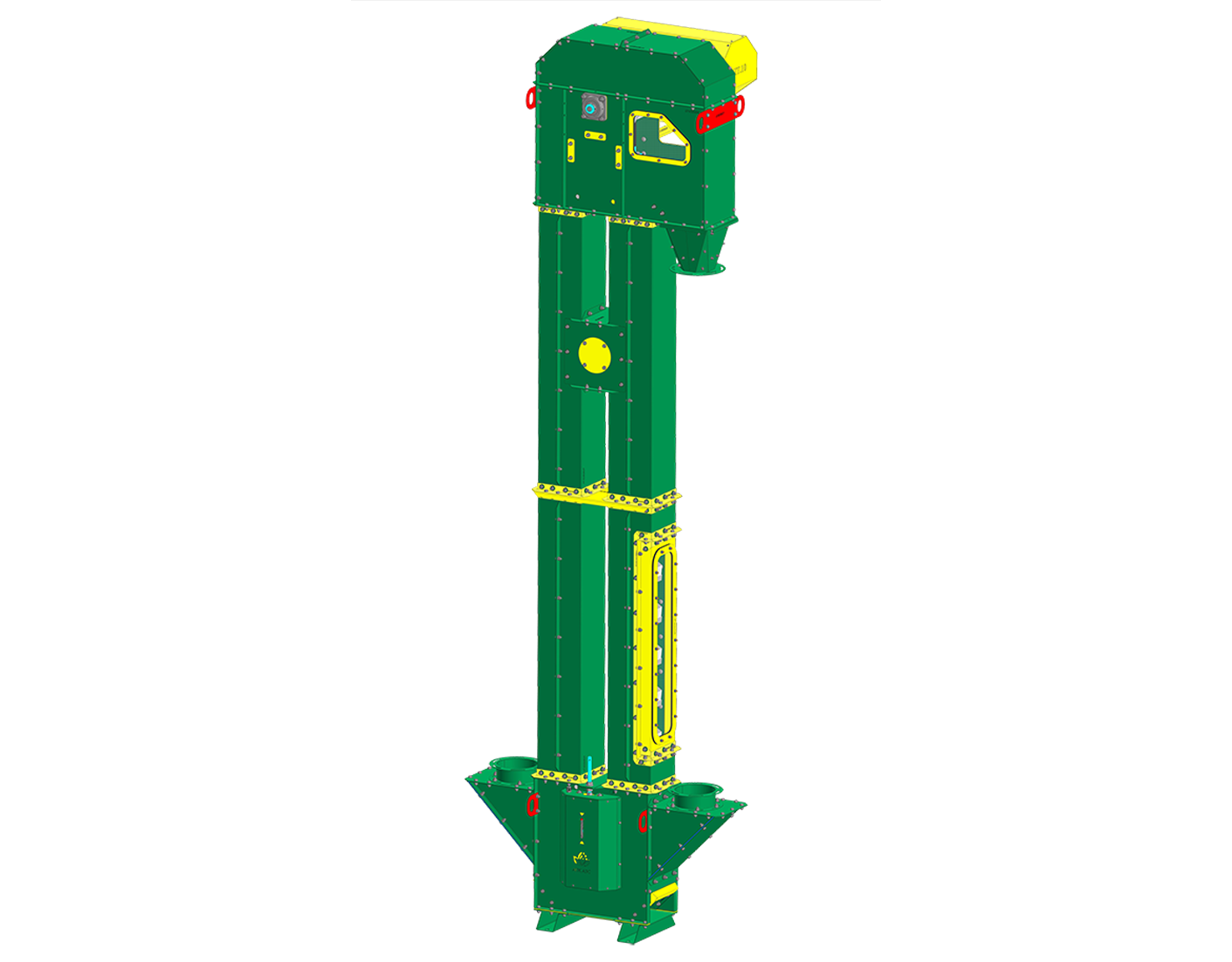 Комплектация: Головка нории; Мотор-редуктор; Выгрузка; Шахта нории; Башмак нории; Засыпной лоток; Натяжная шпилька; Ковши нории; Лента нории; Люк для очистки; Люк обслуживания.