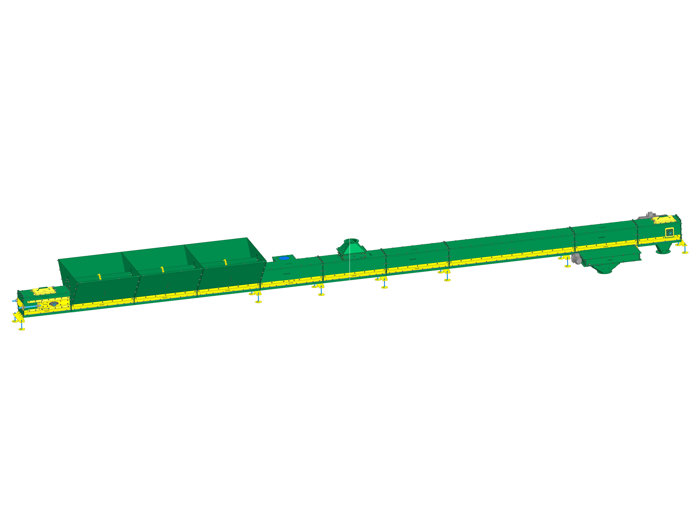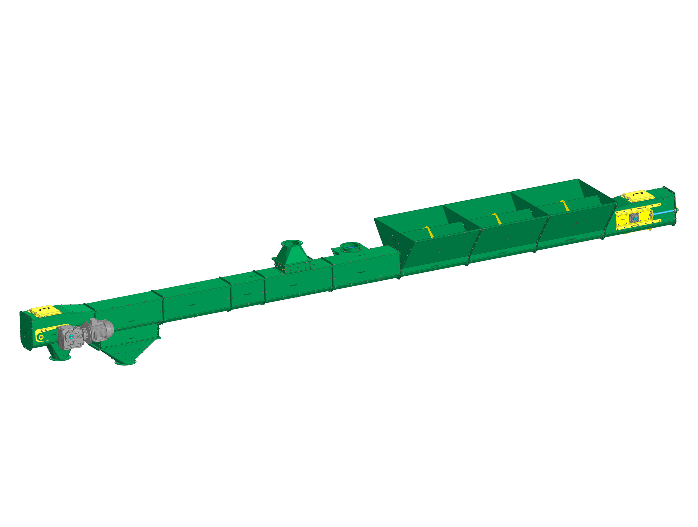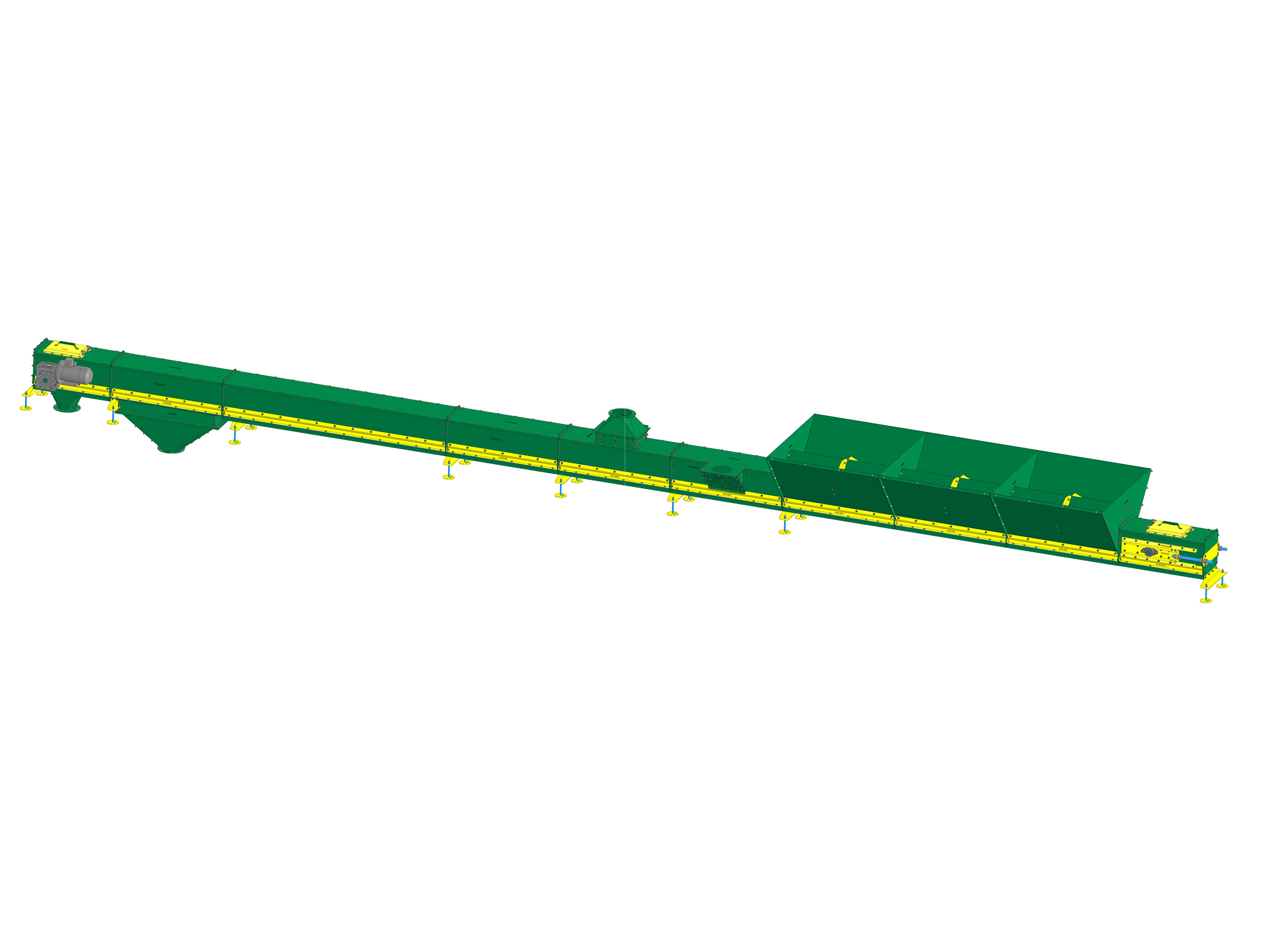Комплектация: Секция привода; Натяжная секция; Мотор-редуктор; Цепь со скребками; Секция линейная горизонтальная; Секция наклонная (угол 15°, 30°, 45°); Секция прямой загрузки; Секция боковой загрузки; Секция двухсторонней загрузки; Аспирационная секция.